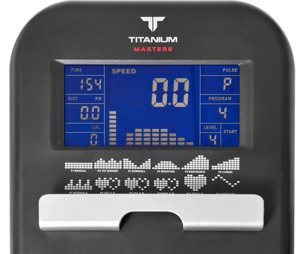 Тренировочный компьютер представлен многофункциональным голубым LCD-дисплеем диагональю 5.5 дюйма (14 см.) с профилем тренировки. На экран выводятся все основные параметры – время, дистанция, скорость, количество сожженных калорий, количество оборотов в минуту, пульс и Ватты. Программная часть состоит из различных тренировочных режимов. Сюда входят 6 предустановленных тренировочных профилей, которые решают все основные задачи пользователя – похудение, развитие выносливости и силы, кардио и интервальные тренировки. Для тренировок с контролем пульса существуют 4 пульсозависимые программы с предустановленными значениями 55%, 75%, 90% и 100% от целевого максимального пульса.