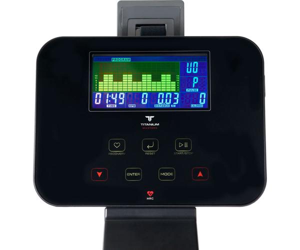 Консоль эллиптического тренажера представлена цветным LCD-дисплеем диагональю 14 см с сенсорными клавишами управления и профилем тренировочных программ. Регулировать нагрузку можно в диапазоне от самой легкой до наиболее тяжелой, к которой готовы только профессиональные спортсмены. Всего можно использовать 24 уровня, в Ваттах диапазон нагрузки составляет от 10 до 350. 12 предустановленных программ направлены на тренировку скоростных качеств, выносливости, укрепления сердечно-сосудистой системы и похудания. Помимо этого, можно воспользоваться самостоятельно регулируемым ручным режимом, а также создать 4 собственные программы. Для тренировок с контролем пульса существуют 4 пульсозависимые программы с предустановленными значениями 55%, 75%, 90% и 100% от максимального пульса (точная цифра частоты сердечного ритма определяется исходя из возраста пользователя). Безусловно, полноценная пульсозависимая тренировка потребует наличия телеметрии – для этого в консоль тренажера встроен приемник частоты сердечного пульса (для полноценной работы потребуется нагрудный передатчик пульса Titanium Masters HR Transmitter или совместимый). Ватт-программа позволяет зафиксировать необходимый уровень нагрузки - он останется постоянным вне зависимости от скорости вращения педалей. Небольшой, но востребованной опцией является подставка под смартфон – просмотр видео, соцсети или простой серф в интернете поможет скрасить рутинность тренировок. Тренажер перемещается за счет транспортировочных роликов, а выровнять его положение на поверхности можно при помощи компенсаторов неровностей пола.