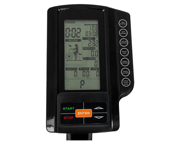 Информативный ЖК Дисплей. Информативный ЖК Дисплей с высокой контрастностью предоставляет полную информацию о параметрах тренировки. Отображаемые параметры: Скорость, RPM, Нагрузка в Вт, Дистанция, Время, Расчет потраченных калорий, Информация о пульсе (ЧСС), Выбранная программа, Фаза работы/отдыха.