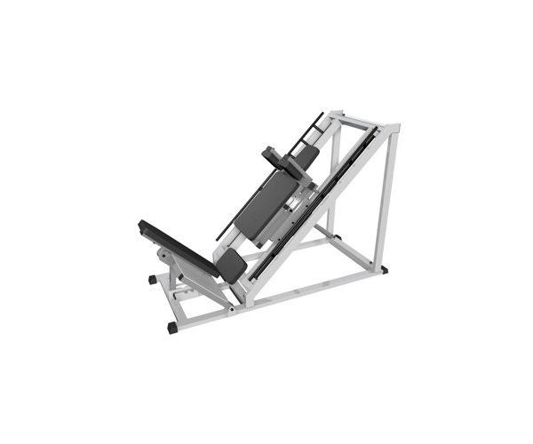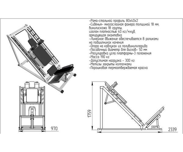 Тренажер Жим ногами + Гак машина имеет линейное движение, которое обеспечивается роликами на подшипниках качения. Тренажер предназначен для проработки мышц бедер и задействует весь массив нижней части тела. Все эти возможности обеспечивают особо плавный ход. Благодаря ловушкам, штангу можно зафиксировать на любом расстоянии. Дополнительные ручки позволяют поддерживать равновесие при работе на снаряде, а рифленая опора для ног предотвращает скольжение. Нагрузка при выполнении упражнений создается с помощью навесных дисков.
